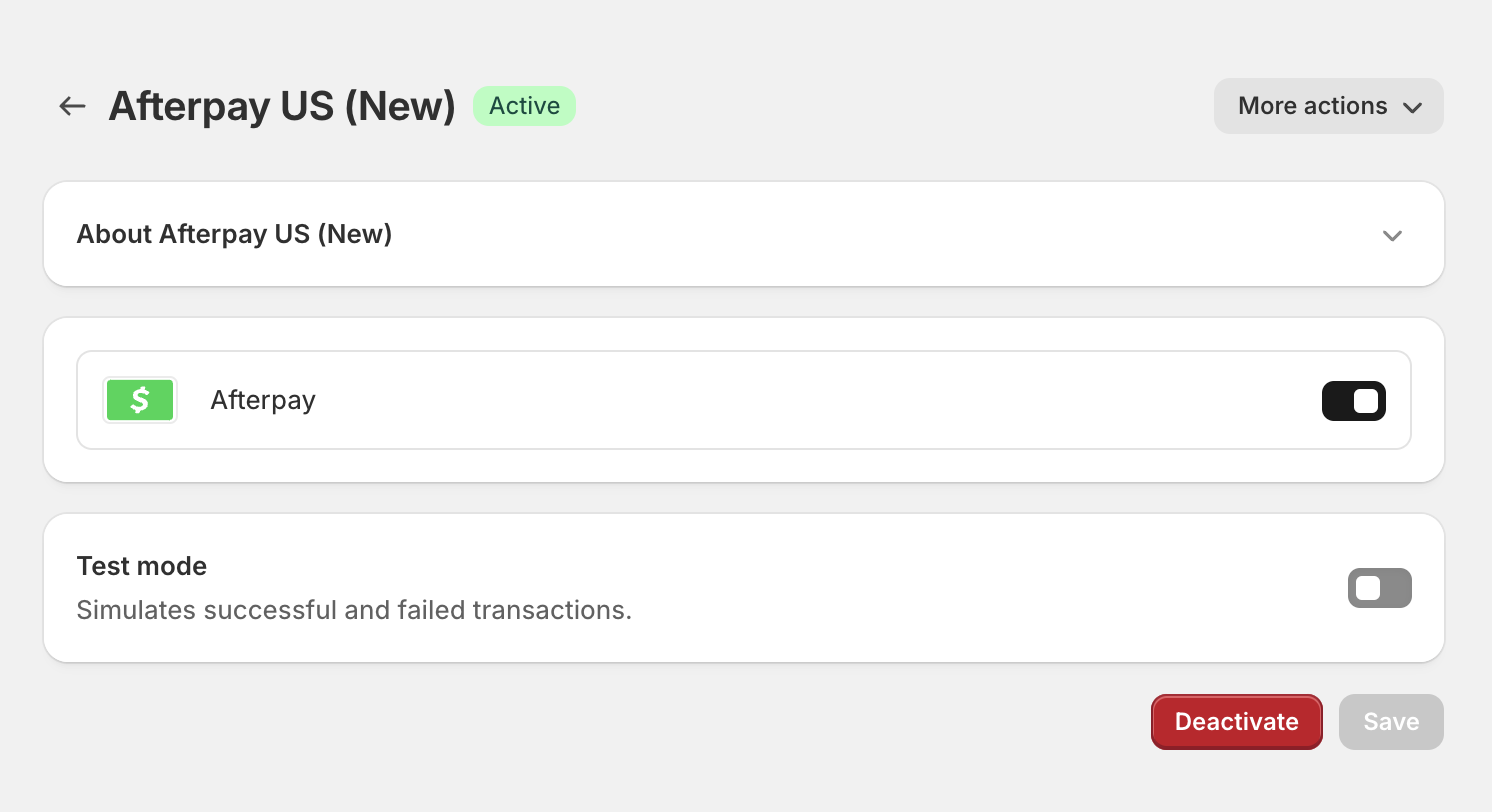 On the Afterpay (New) screen, click Deactivate, then click Deactivate again to confirm your choice.
